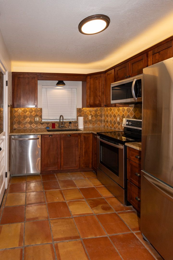 Renovated kitchen with stone countertops & stainless steel appliances